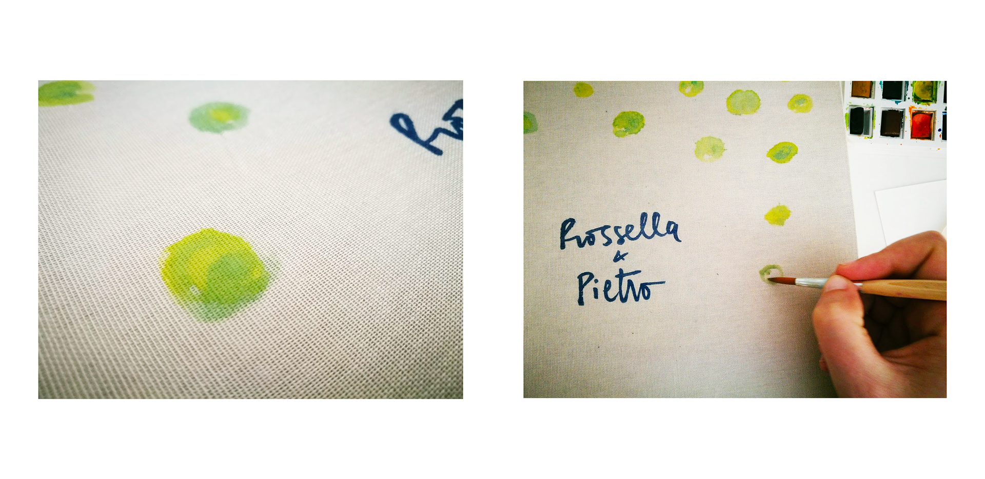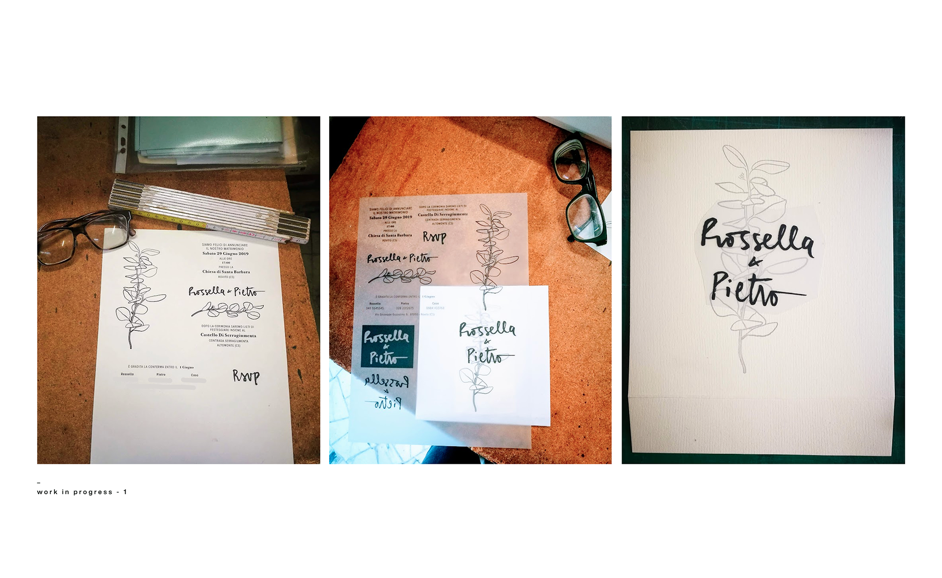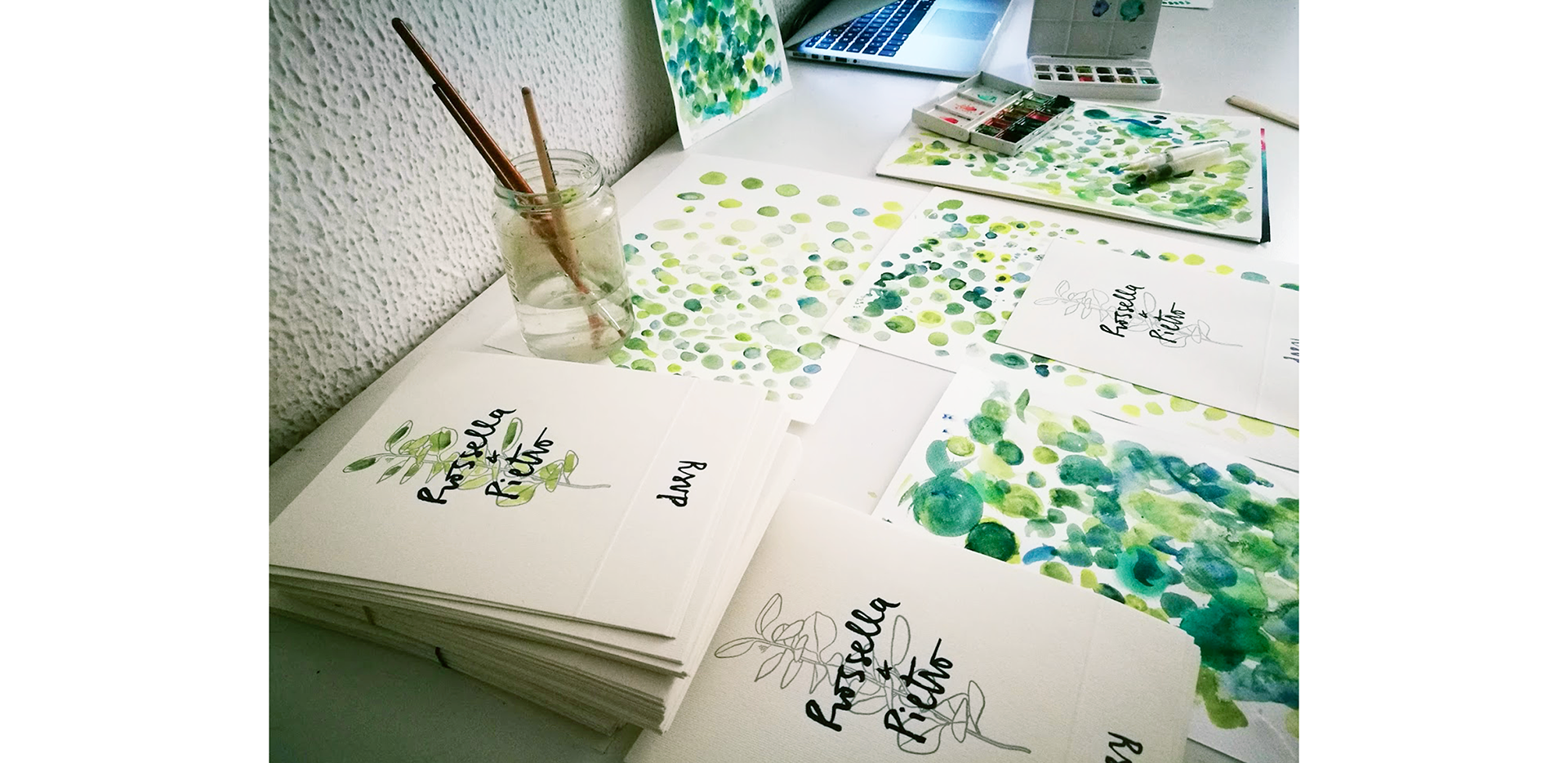 The result is 150 unique hand-painted invitation cards, packaged in squared letter envelopes with names printed in dry embossed.